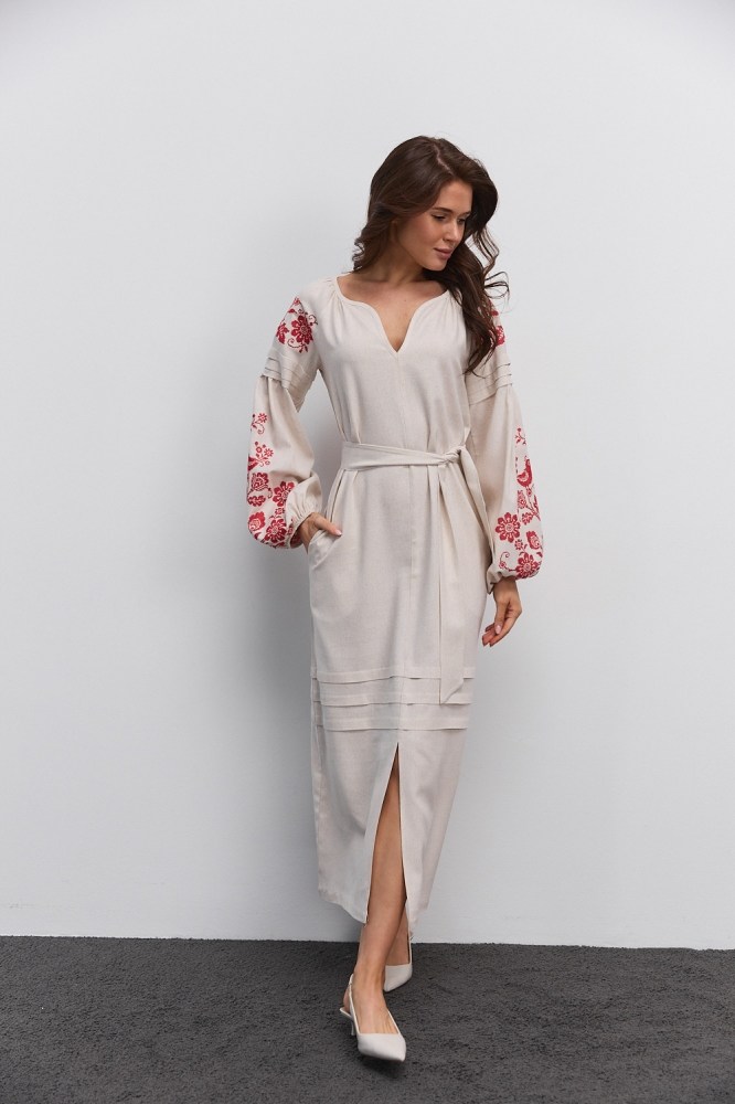 Длинное платье-вышиванка светло-бежевое с красным деревом жизни крестиком