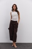 Силуэт трапеция в одежде тоже имеет свои особенности - расширение от линии плеча или проймы. Одежда, выполненная в этом силуэте, может быть как свободной по всей длине, так и фиксироваться изящным поясом в области талии.
