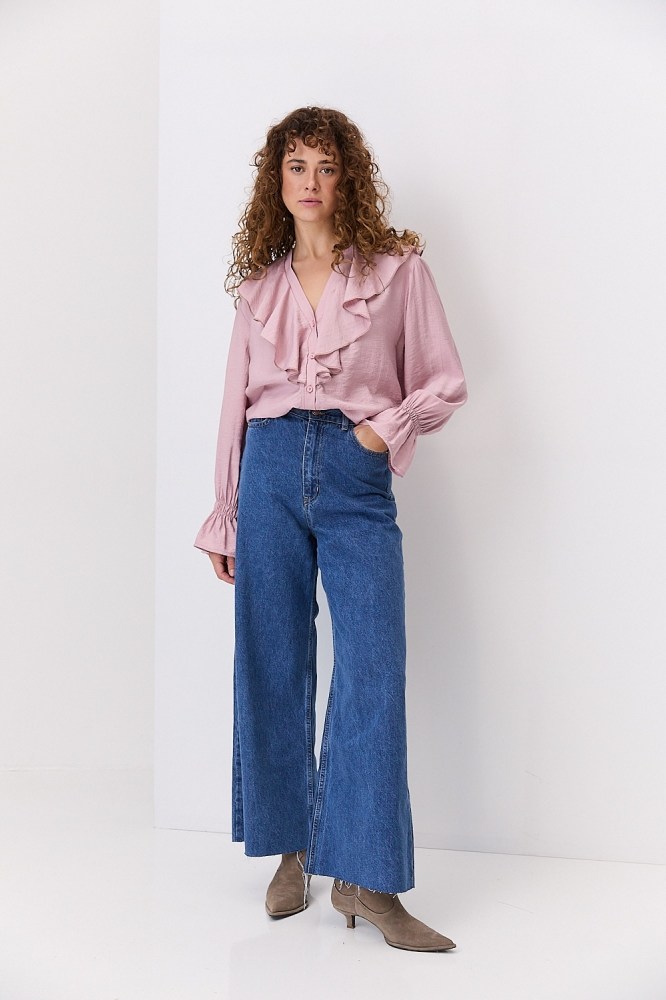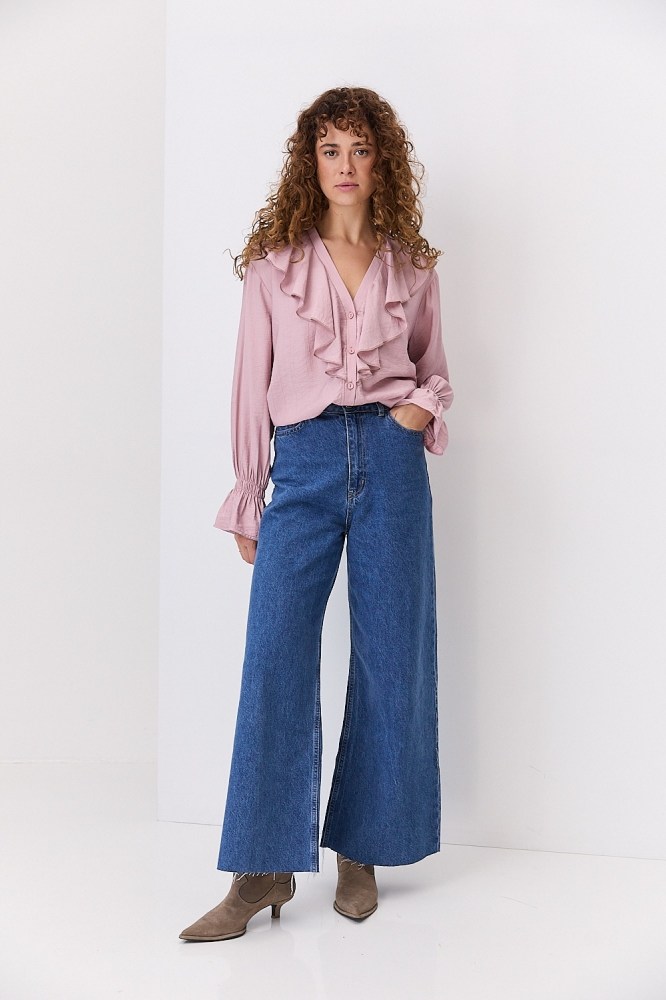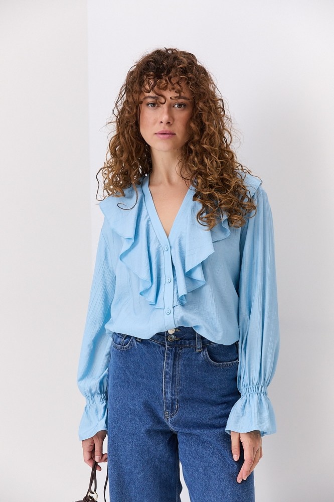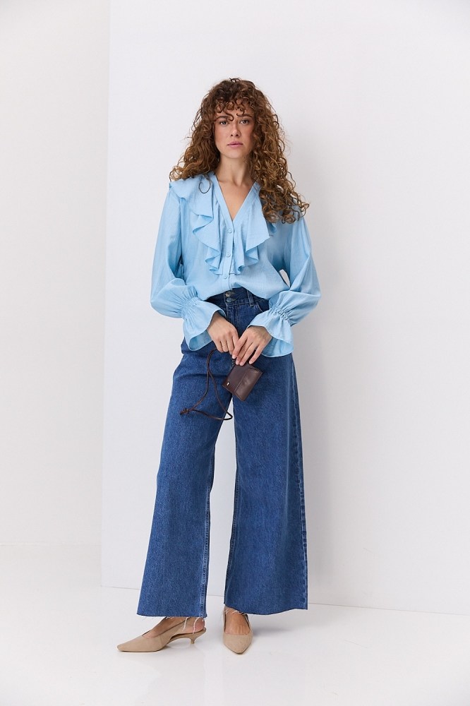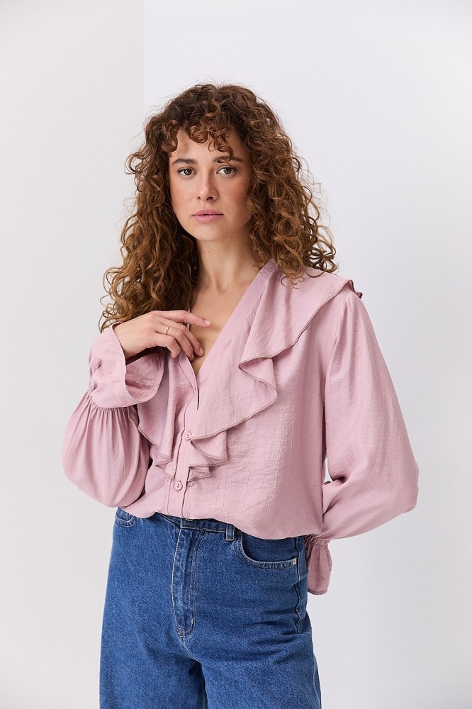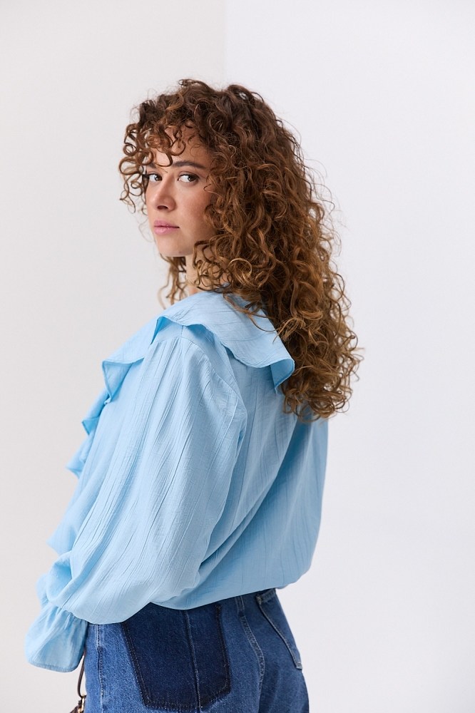 Блузка с рюшами на плечах, рукавах или груди добавляет объема верхней части силуэта, поэтому её лучше заправить за пояс, комбинируя с различным низом, чтобы добавить акцент на талию. Лучше всего такие модели смотрятся с шортами-бермудами, брюками-палаццо, кюлотами и трапециевидными юбками, создавая вместе идеальный женственный силуэт.