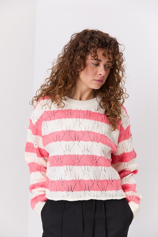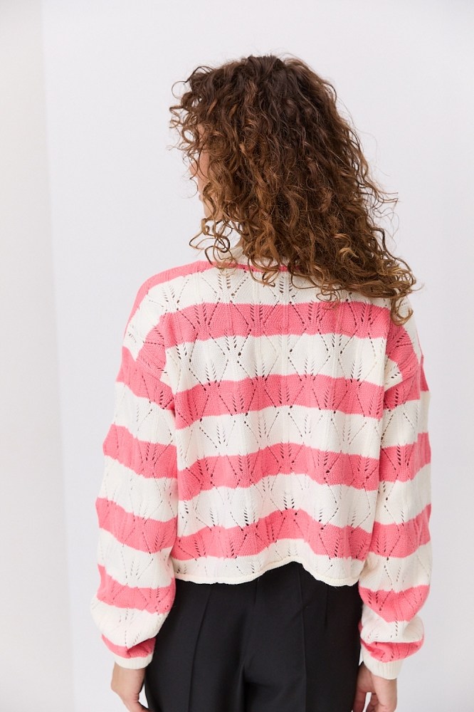 Женский вязаный джемпер ажурный молочный в коралловую полоску